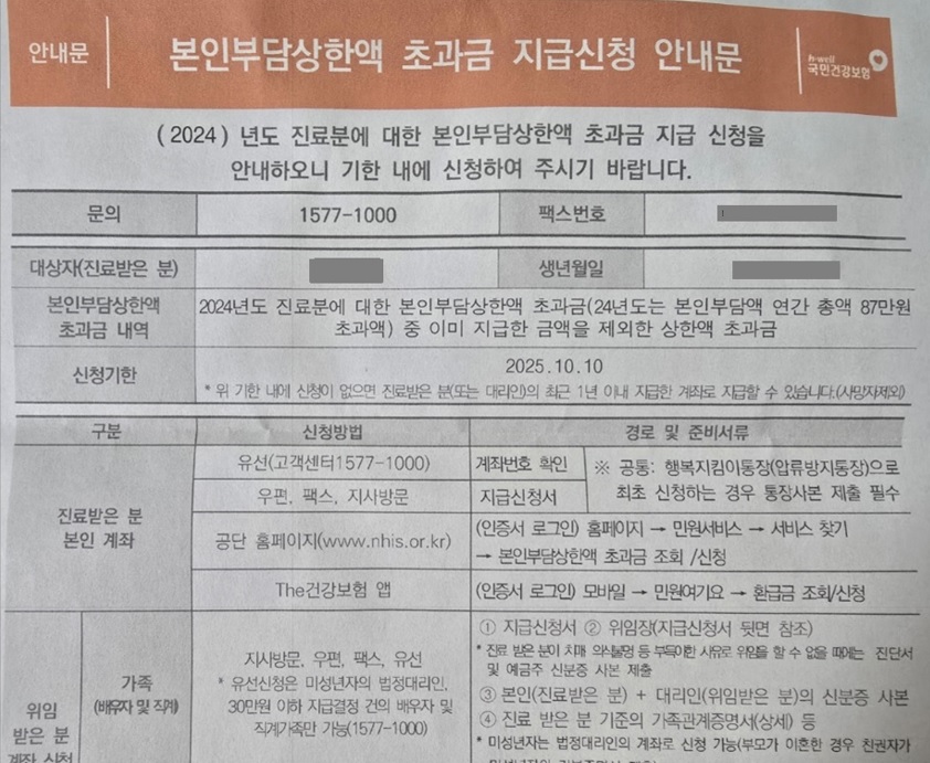 세 번째는 비급여 항목 주의입니다. 상한제는 건강보험이 적용된 본인부담금에 한해서만 계산됩니다. 즉, 미용 목적의 시술이나 비급여 진료는 해당되지 않으므로, 이런 항목을 많이 이용한 경우에는 환급 대상이 아닐 수 있어요.